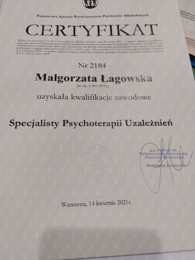 Jestem certyfikowanym Specjalistą Uzależnień (certyfikat PARPA). Pracuję z dorosłymi i młodzieżą od lat 16. W zakresie świadczonych przeze mnie usług znajduje się pomoc osobom uzależnionym, współuzależnionym oraz Dorosłym Dzieciom Alkoholików (DDA). Pracuję w nurcie zintegrowanym, czerpię głównie z podejścia poznawczo -behawioralnego oraz humanistycznego. Aktualnie pracuję w Poradni Leczenia Uzależnień i Współuzależnień, udzielam także konsultacji z powyższego zakresu w Ośrodku Pomocy Społecznej. Swoje doświadczenie zawodowe poszerzam poprzez udział w licznych szkoleniach i samorozwój. Dbam o to, żeby moja praca poddawana była regularnej superwizji. Najważniejsze w pracy z pacjentem jest dla mnie indywidualne podejście oparte o stworzenie bezpiecznej relacji terapeutycznej, empatie i autentyczność.